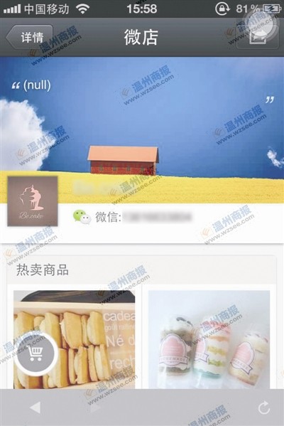 在欧洲城开甜品店的谢女士也紧跟潮流,“我的微店就是这几周刚开张的。”她告诉记者,身边朋友最近都在玩微店,有买家也有卖家,几周以来接到了四五笔单子。从事女装零售的胡小姐在页面上推介微店时,注释了这么一段说明,“主要是为了方便大家看店铺的产品,平时微信页面发的产品太分散,微店的话产品一目了然。不放心微店付款方式的话,还是按照以前的付款方式,支付宝或网银都OK。请记得关注我的微店哦。”