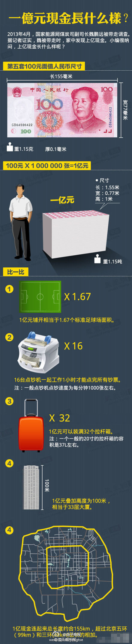 上亿现金是个什么概念呢?睿智的果壳网告诉你:若是刚出库的新钞,1张百元钞票重约1.15克,1亿就是1150公斤;1万叠一起厚约1cm,一亿就是100米高……掐指算了一下:1亿现金假如都是百元大钞,连起来总长度约155km……155km,能从温州市区一路铺到泰顺去了……