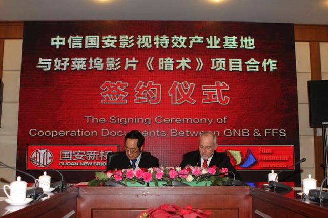 电影《暗术》是FFS集团与中信国安计划的首部合拍片,也是从创意策划期就明确了与中国合拍、故事核心设置为中国元素的好莱坞商业大片。作为双方代表,美国电影投资集团FFS总裁大卫·谢尔顿和国安新桥影视传媒投资有限公司董事总经理屈建平,今天在合作意向书上签字。