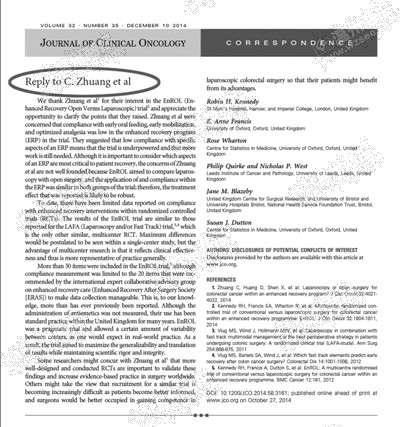 去年6月份,庄成乐在浏览美国肿瘤学顶尖期刊《临床肿瘤学杂志》时,发现一篇由英国牛津大学教授发表的论文存在一个漏洞。这篇论文主要是围绕外科学领域的两大“明星”成员“腹腔镜手术”和“加速康复外科”展开(两者都被认为对减轻病人的手术创伤应激,加速术后康复有着重要意义),以两者对病人术后康复的影响程度进行对照性的临床实验研究。结果该研究表明,在实施“加速康复外科”的基础上,“腹腔镜手术”仍然对病人的术后康复起到重要作用。