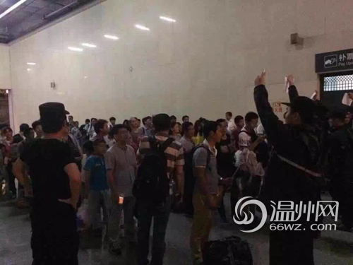 【滞留乘客800余人15辆大巴送返回家】最新消息,动车上滞留乘客人数更正为八百多名。苍南公安局已出动特警等警力,协助火车站派出所做好安置滞留乘客。目前,苍南警方调来15辆大巴,准备运送不同地区的市民回家。图为工作人员让不同地区的乘客按秩序排好队,等待大巴统一送他们安全回家。(苍南支站记者林超群)