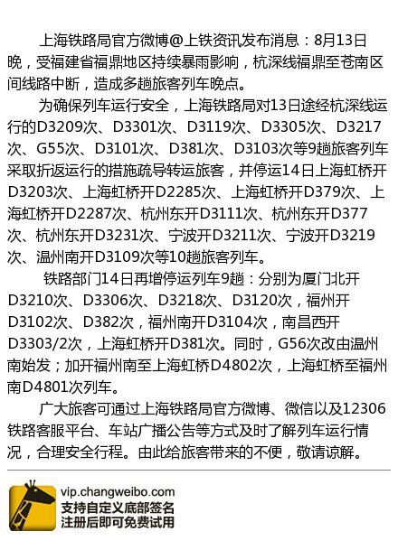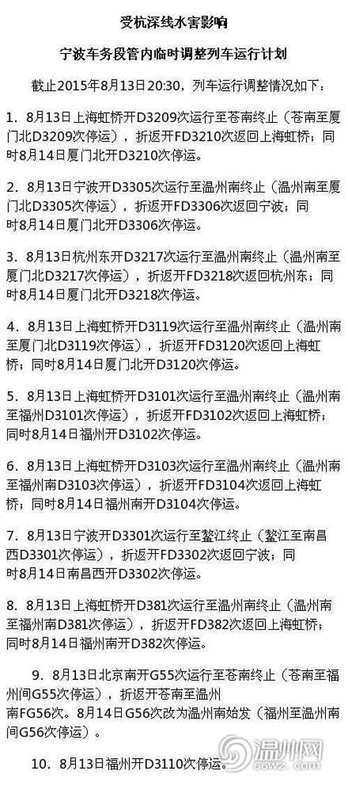 【出行资讯】 #上铁发布#8月13日晚,受福建省福鼎地区持续暴雨影响,杭深线福鼎至苍南区间线路中断,造成多趟旅客列车晚点。为确保列车运行安全,上海铁路局对13日途经杭深线运行的9趟旅客列车采取折返运行的措施疏导转运旅客,并停运14日上海虹桥、杭州东、宁波、温州南等地始发的10趟旅客列车。具体详见下图: