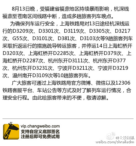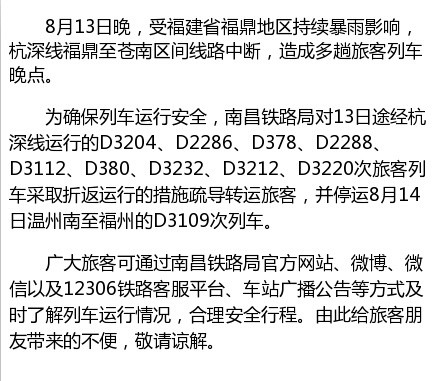 【出行资讯】上海铁路局官方微博@上铁资讯 发布消息:8月13日晚,受福建省福鼎地区持续暴雨影响,杭深线福鼎至苍南区间线路中断,造成多趟旅客列车晚点。为确保列车运行安全,上海铁路局对13日途经杭深线运行的9趟旅客列车采取折返运行的措施疏导转运旅客,并停运14日10趟旅客列车。