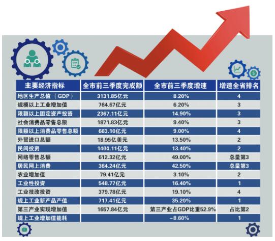 2012年,我市GDP增长6.7%,居全省末位;2013年增长7.2%,增速比上年提高0.5个百分点,位次持平;2014年增长7.7%,增速比上年提高0.5个百分点,位次比上年提高1位;今年前三季度增长8.2%,增速比上年提高0.5个百分点,位次一下子比上年提高了6位,跃居全省第四。