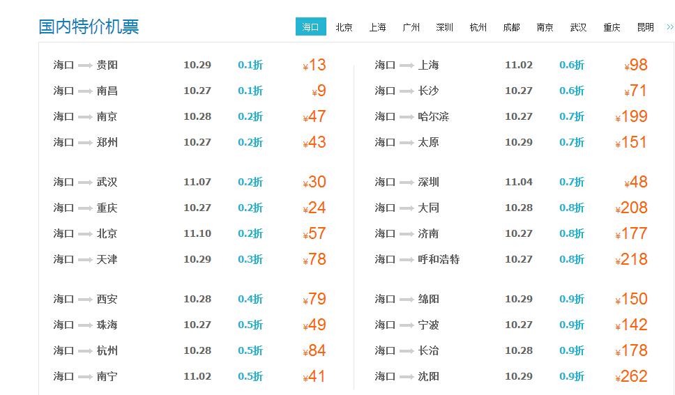目前海口至重庆、武汉、郑州、南昌等航线的低折扣机票已跌破了1折,最低达到0.6折左右,其中海口-重庆机票最低价格更是达到100元。杭州、贵阳、昆明等热点旅游城市的1-2折机票让人眼花缭乱。北京、上海等商务航线1.5折左右的票价在各航空公司随处可见。平日里不可想象的沈阳、哈尔滨、乌鲁木齐、兰州等远程航线2折票价也终于出现……真是遍地白菜价!而海口到贵阳、武汉的价格更是跌破白菜价,票价分别是60元及80元!