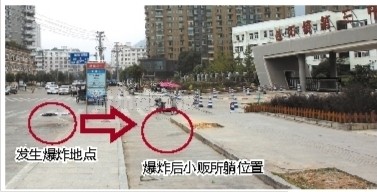 昨天,记者来到事发现场看到,爆炸发生点位于一公交站头附近,目测距离昆阳三中校门20多米远。爆炸产生的碎片,将水泥地面砸出几个明显的坑,地上仍残留着几处血迹以及一些漏气干瘪的气球。