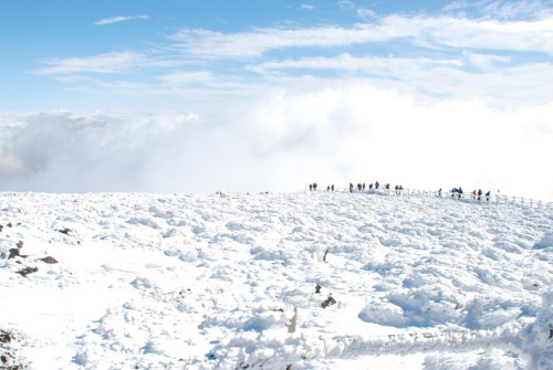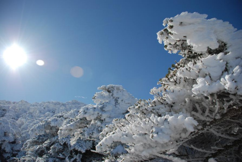 山上生长着众多珍稀植物,寒气结冰凝于木上,形成雾凇,细看宛如冰晶烛台,成为汉拿山一景。