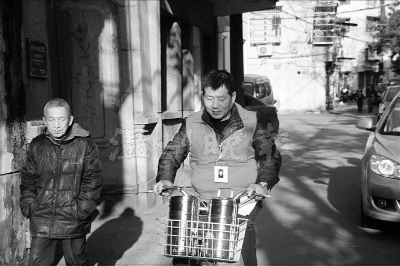 庆年坊社区“爱心食堂”志愿者为不便出行的老人送餐上门。