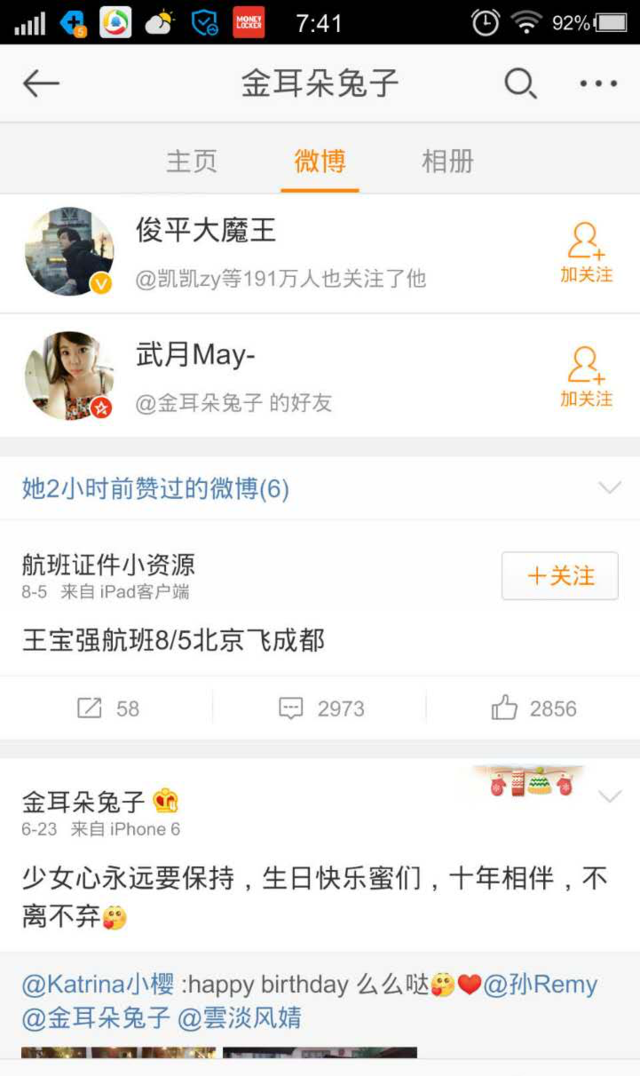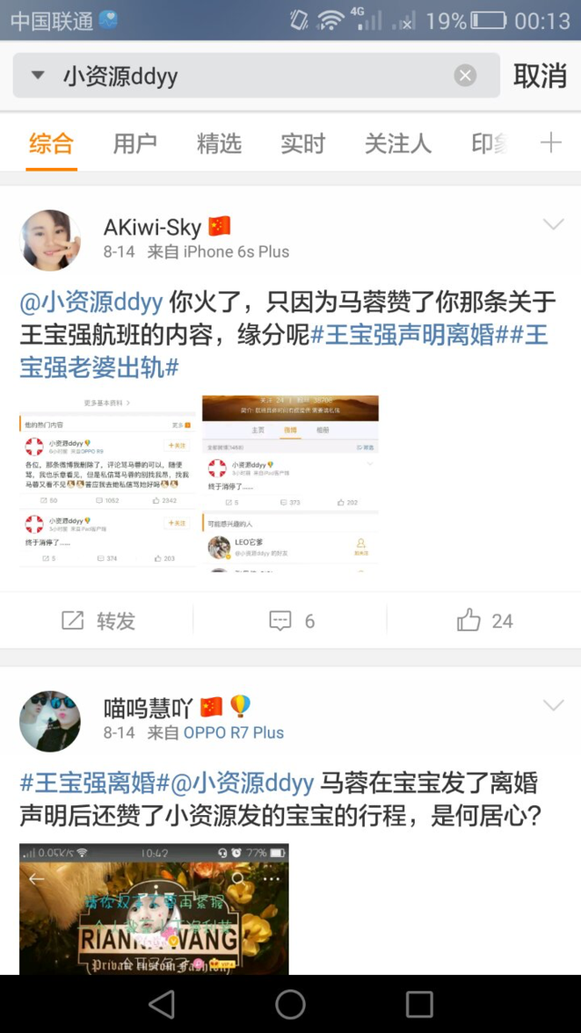 目前,微博上马蓉点赞王宝强于8月5号从北京飞成都的截图有两个版本:一是点赞来自微博名“小资源ddyy”的微博,内容为“王宝强航班8/5北京飞成都”。检索与此微博相关联的爆料信息,可检索出三条。