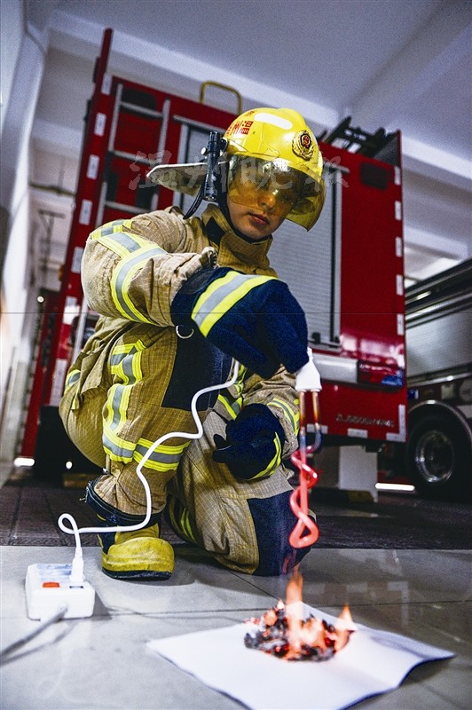 昨天下午4点20分,实验开始。消防官兵穿戴好作战服后,将“热得快”接通电源,并将其放置在A4纸上。