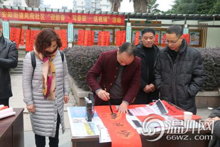 温州网讯“贴春联送祝福”是中华民族一直延续的表达人们向往美好生活的传统文化。为弘扬这一传统文化,丰富群众的文化生活,积极营造欢乐、喜庆、文明、和谐的节日文化氛围,让广大社区居民能切身感受到中国传统文化的气息,近日,瑞安市安阳街道风荷社区特邀请辖区内的书法名家及社区书友会成员,在社区反邪教文化广场开展了以“迎新春?写春联?送祝福”为主题的反邪教警示教育宣传活动。