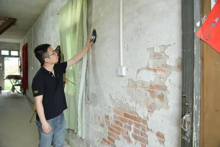 记者查看华中社区C级危房内的危房监测器。杨德玮摄