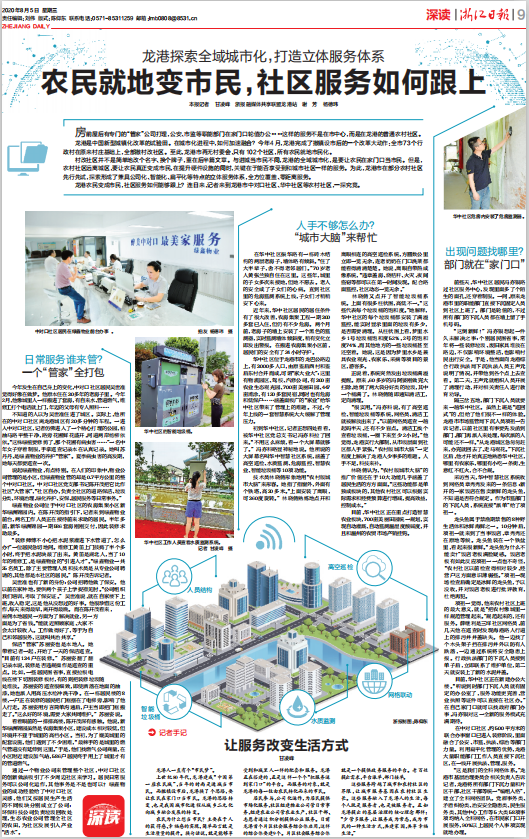 村改社区并不是简单地改个名字、换个牌子,重在后半篇文章。与进城当市民不同,龙港的全域城市化,是要让农民在家门口当市民。但是,农村社区远离城区,要让农民真正变成市民,在提升硬件设施的同时,关键在于能否享受到和城市社区一样的服务。为此,龙港市在部分农村社区先行先试,探索形成了兼具公司化、智能化、扁平化等特点的立体服务体系,全方位覆盖、零距离服务。