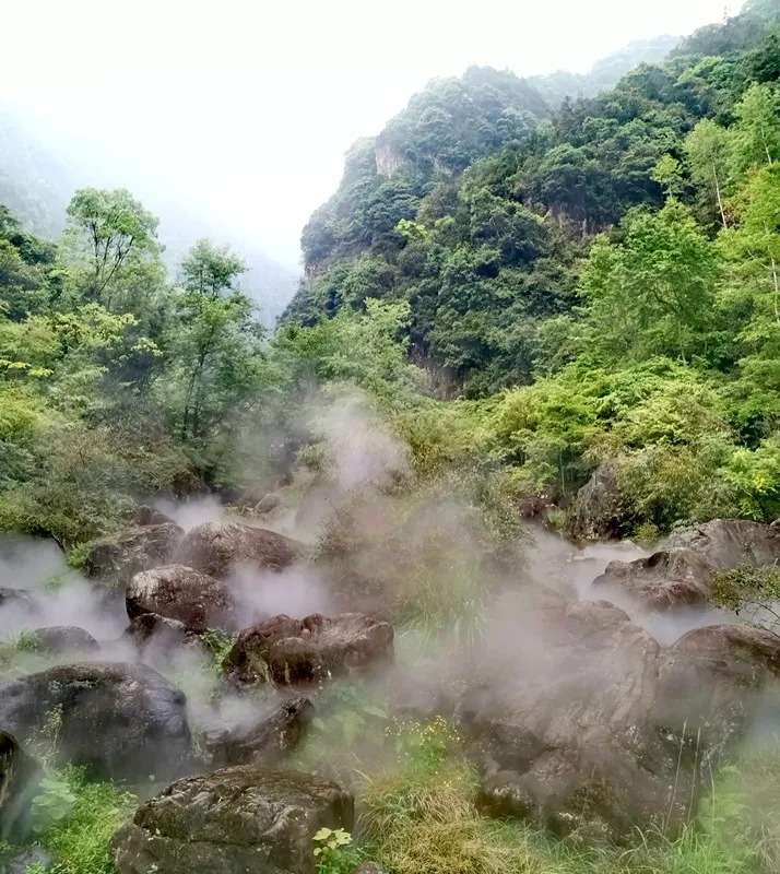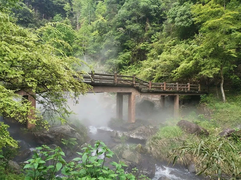 走进景点南入口,这里烟雾缭绕,如临仙境般。这是百丈漈景点特意打造的“雾森”景观。一层淡淡的水雾,溪流中的大石若隐若现,百丈漈宛如披上一层面纱,增添一抹无以言表的神秘感。置身茫茫雾海中,呼吸着清新的空气,十分惬意。