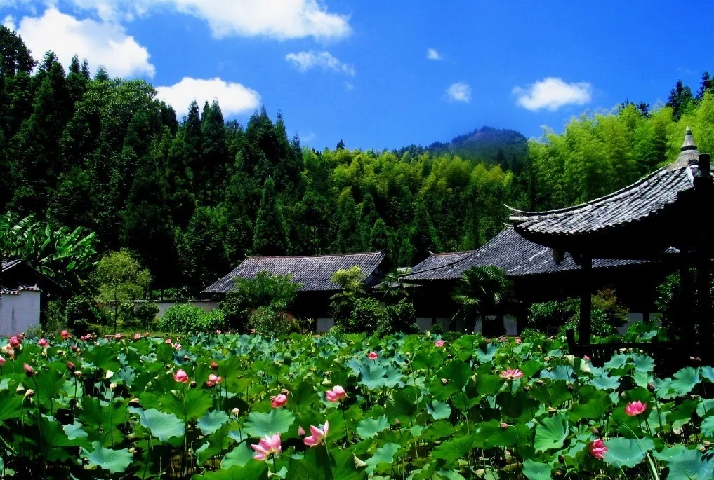 武阳村,地处650米的高山平台,四周环山,冬无严寒,夏无酷暑。每逢夏季,沿着荷塘慢走,成片绵延的荷花亭亭立在水中。满眼碧绿铺天盖地,和武阳村青砖黛瓦的民居、历经沧桑的古松相映成景,引人入胜。
