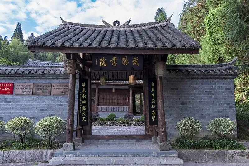 武阳书院隐在一处幽静的山岙里,周围古树参天,院外有清泉流过,门口有荷塘一湾。书院内摆设古朴典雅,有孔子像,有书桌,有卧房。