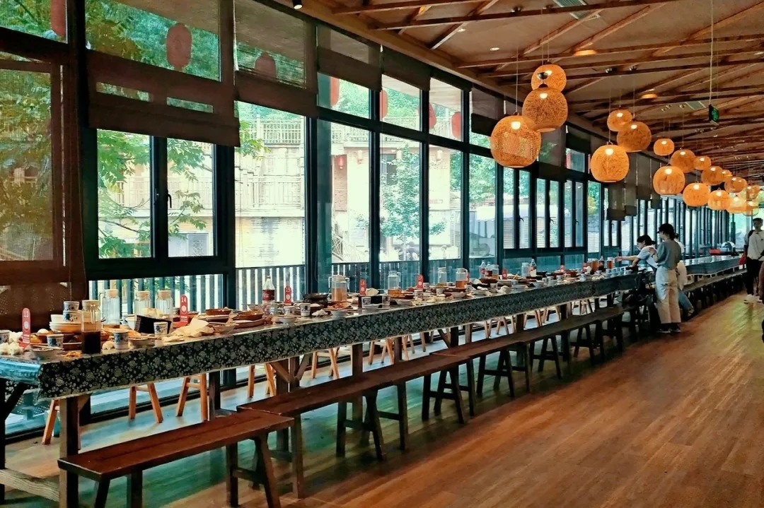 长桌宴是以传统的畲家特色美食:竹筒饭、糯米糍粑、畲家豆腐酿等6个冷盘11个热菜组成。一碗碗、一盘盘的菜肴通过长长的排列组合,四人一圆筐,为远道而来的各位宾客献上满满的祝福。