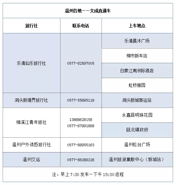 现在,还可以通过文成旅游直通车前往文成噢~每周三、周六固定发班,从温州市区、洞头、永嘉、乐清出发。
