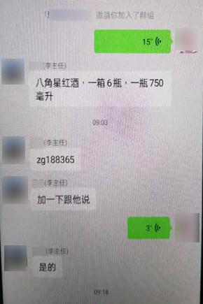 随后,“李主任”向王老板推送了“酒水商”的微信,并指定要5瓶单价为1万元的红酒和6瓶单价为750元的红酒。