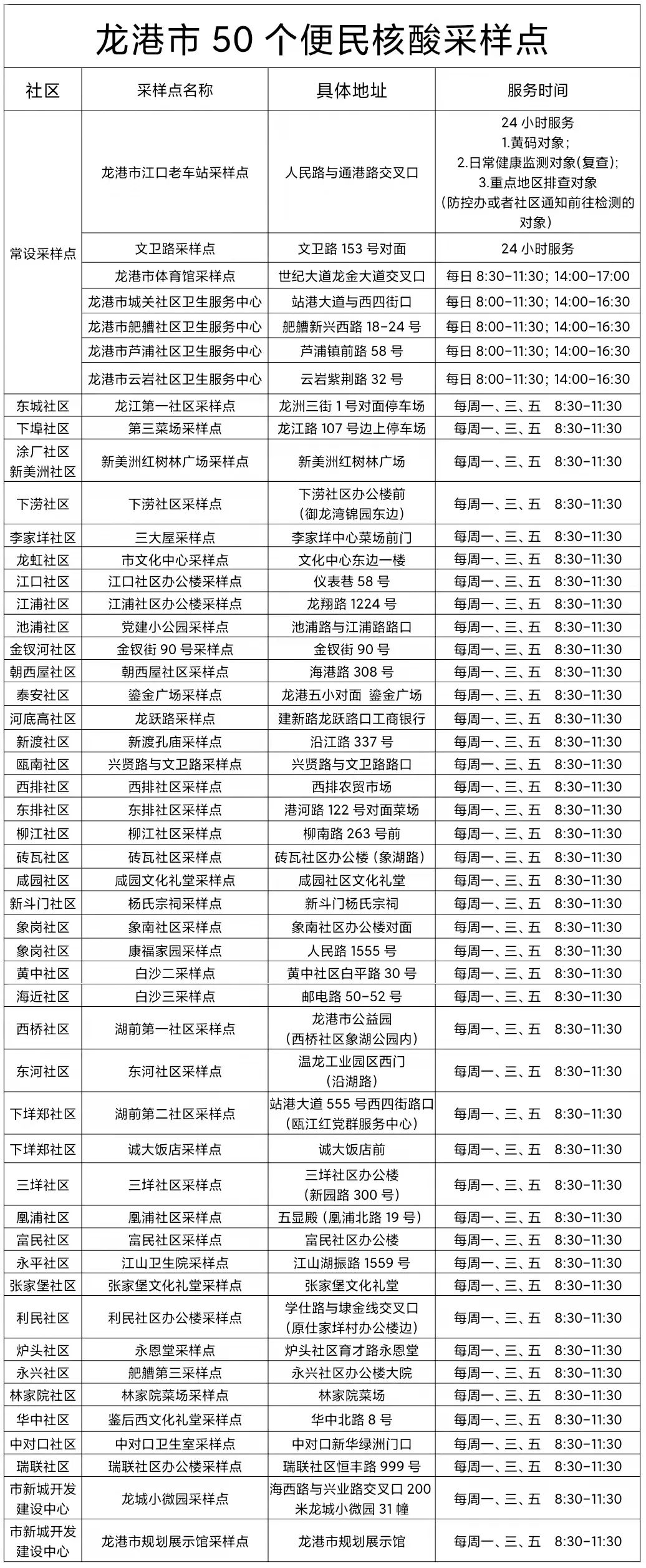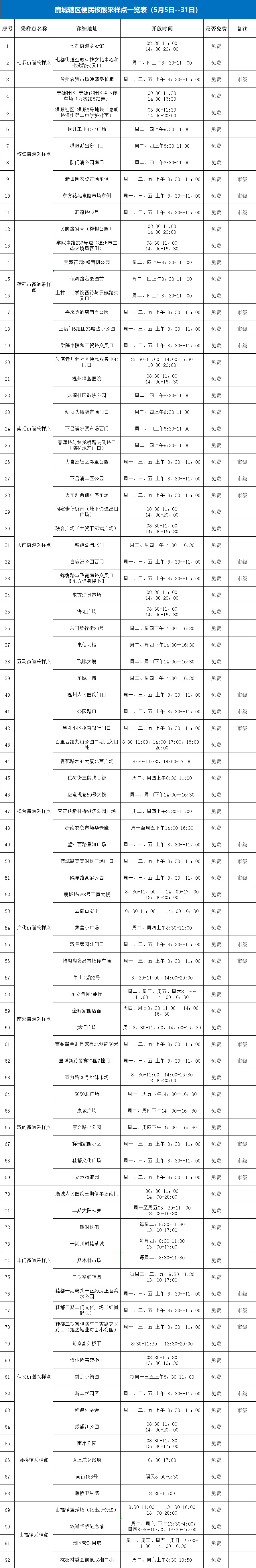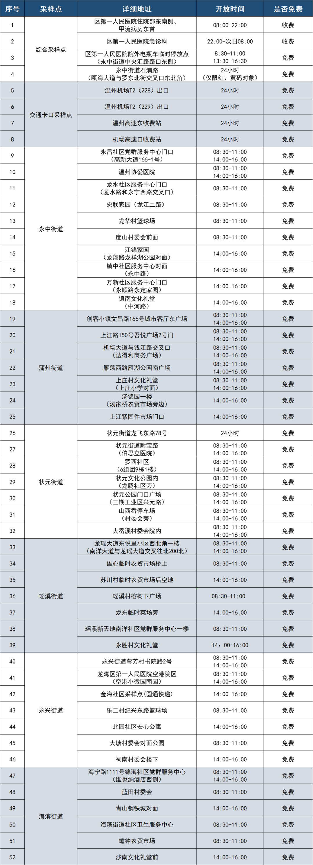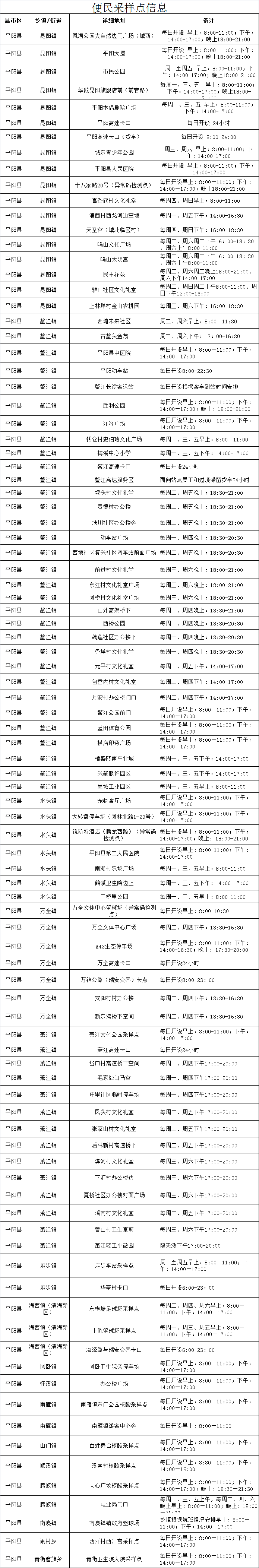 龙湾区便民采样点信息一览表