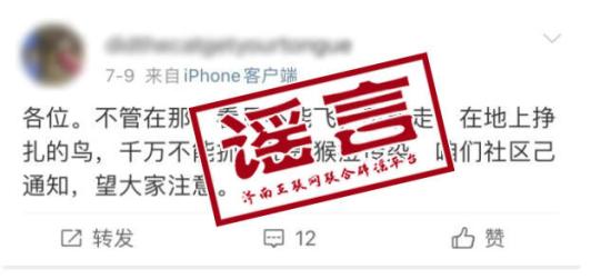 “从现在开始,无论是小区院内还是其它场所,发现有死亡的小鸟、燕子,不要用手触摸,远离。家里有孩子的一定要强调,看见不能飞,不能走,在地上挣扎的鸟,千万不能抓,怕是猴痘传染,有关社区己通知,望大家注意。”近日,这样一则消息在网络传播。