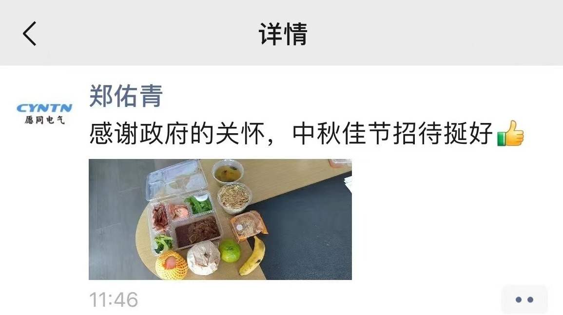 温州网乐清支站讯 “感谢政府的款待,中秋佳节,招待挺好。”9月10日是中秋节,当天中午,正在酒店隔离的郑先生意外地收到了中秋礼物,于是高兴地发了一条朋友圈,称收到这份节日礼品,他感到非常惊喜。