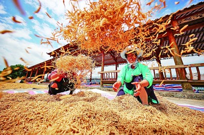村民在贵州省黔东南苗族侗族自治州丹寨县兴仁镇台辰村晾晒太子参。新华社发
