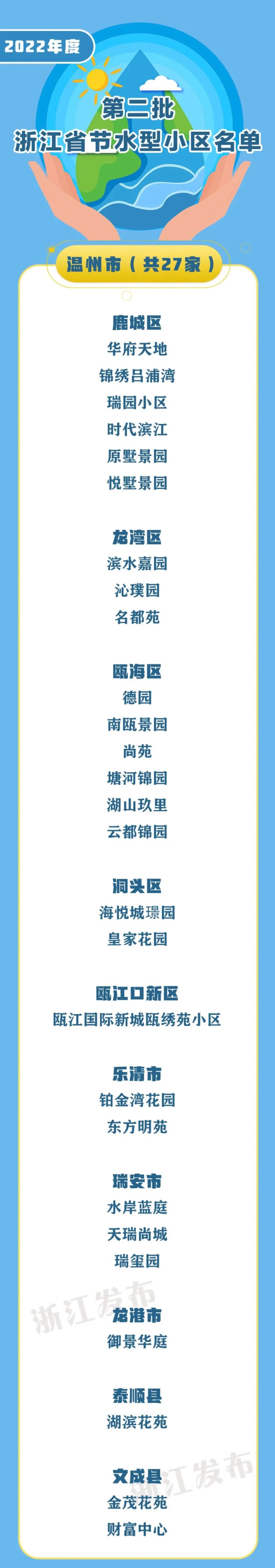 近日,省建设厅公布2022年度第二批浙江省节水型单位、居民小区名单,温州共有2家单位、27个小区上榜。一起来看全名单↓↓