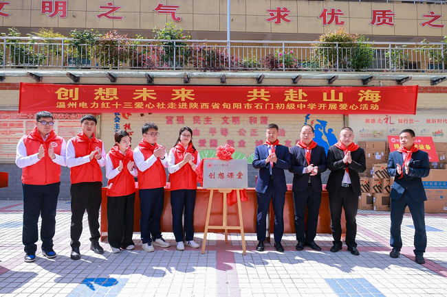 现场,温州电力红十三爱心社代表徐青青与陕西省旬阳市石门初级中学校长黎明智共同为“创想课堂”揭牌。爱心社将价值15万元的教学设备捐赠给石门初级中学,分享优秀教育资源。“‘创想课堂’的建设,意在搭建东西教育资源共享共富平台,一同创想未来,共赴山海。”徐青青说。