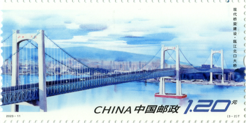 其中,瓯江北口大桥邮票图案采用水彩的艺术表现形式,运用干湿结合的创作手法,结合俯视、仰视、平视等不同视角,展现出桥梁的外形特点和凌空飞架、穿江越岭的宏伟气势,同时展现出桥旁优美的生态环境和独特的自然景观。