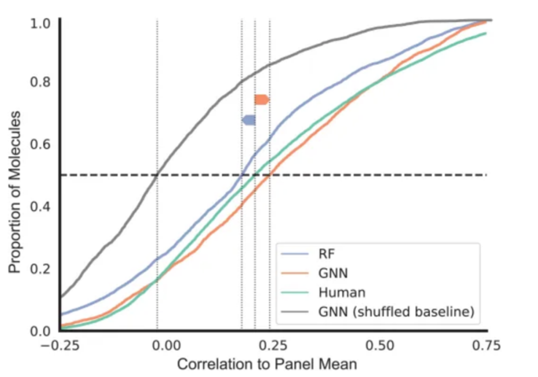 研究人员对GNN模型和人类组进行了气味测试。结果显示,AI在53%的化学分子以及55%的气味描述准确度方面表现优于人类专家的特性。
