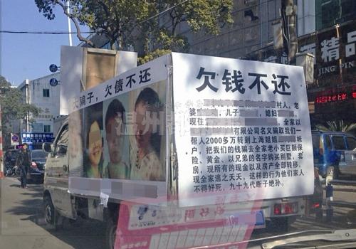 苍南街头现“讨债车” 贴“欠债一家人”照片住址