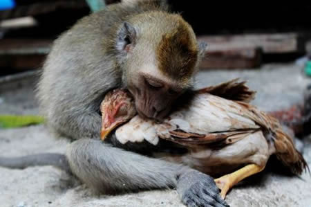 印尼爪哇岛的一只猴子与一只鸡双双坠入情网,它们亲密相依,温柔相拥的画面十分温馨感人。