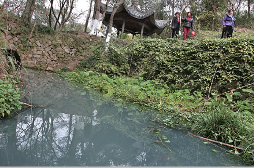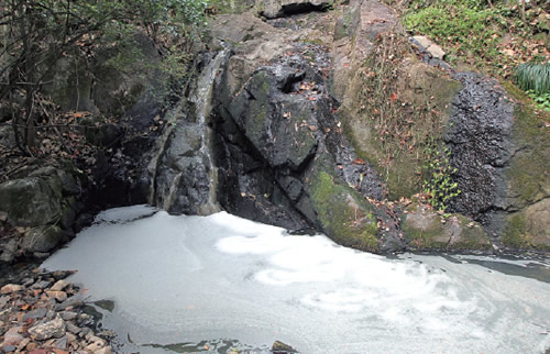 整条溪流的源头在景山山顶,溪水流经放生池。以放生池为界限,是截然不同的景象:上游清澈干净,而沿东南方向流向净水村的水流则成了大黑脸。距放生池大约100米处,有一处四五平方米大小的水洼,水面漂满了白色泡沫,很像洗涤剂倒入水中后产生的泡沫。