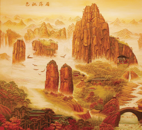 答:人民大会堂管理局要求我们创作的作品要好看,但又不能太抢眼,要与浙江厅的整个装饰风格氛围相协调。这种度的把握是最难的。所以在制作前创作团队先考察了浙江厅等几个厅的装饰情况,同时也去雁荡山采风完善设计图稿。在具体制作中,融合了国画、油画、雕塑和摄影艺术手法。比如远山采用国画艺术手法,天空、云雾等整个画面色彩采用油画的技法,两者相互衬托,使得画面空间感更强、更深邃,也更写意。画面视觉中心的合掌峰等近处山体采用写实的雕刻表现手法,凸显大气豪放的山势,蕴含团结向上、壮志凌云的美好寓意,近处的植物则采用了摄影的手法去制作调色。多种艺术技法的融合使得画面呈现出更多风格。