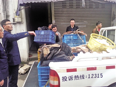 执法人员扣留了无证作坊的生产原材料。龚培诚摄