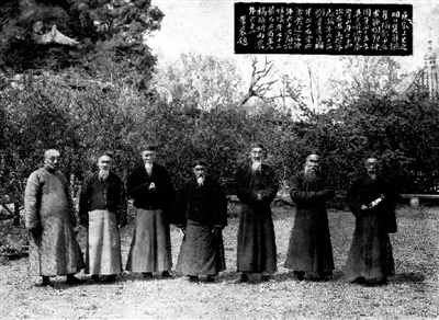 1940年杨雨农(左一)与当时名士高谊、黄式苏、施仲周、洪邦泰、王理孚、刘景晨摄于温州巽园