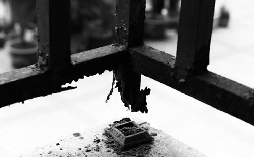 日晒雨淋,铸铁栏杆脚已被锈蚀断裂。