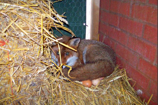在英国朴茨茅斯的飞牛小学(Flying Bull Primary School),一日午休时间,当几个负责收集鸡蛋的学生走到校内鸡舍时,他们目睹了匪夷所思的一幕:一只狐狸惬意地坐卧在几只鸡蛋上面,丝毫没有要离开的意思。而母鸡们的地盘虽然被这位“不速之客”占据,无法回到窝里继续孵蛋,但它们却似乎对这件事不以为意,悠闲地在一旁溜达。