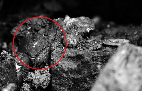 据现场工作人员介绍,古墓内发现银制物品(图中红圈处)和数十枚铜钱。 见习记者 黄攀/摄
