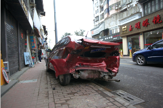 前天上午,记者在事故现场看到,被撞的这辆红色广本三厢轿车停在市区广场路73号前的人行道与街边上,挂着市区牌照,车尾完全凹陷,车头卡在路灯柱上,路灯掉落在车头旁。