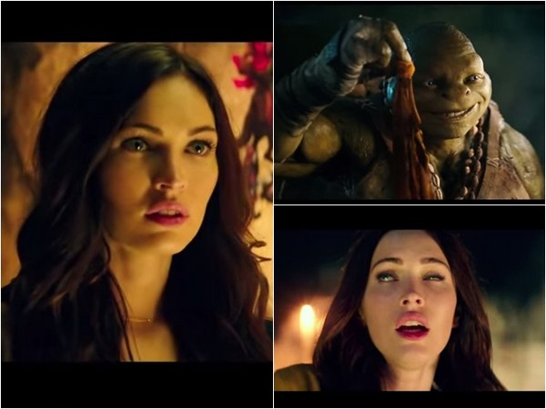 梅根福克斯(左)在电影中第一次看到忍者龟(右上)的真面目,吓得当场晕倒。