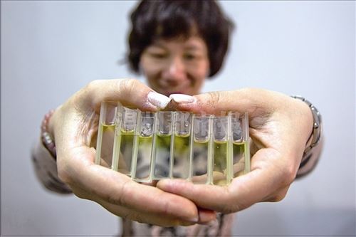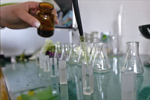 看颜色分析结果 3分钟后,比色皿被取出,邹展翌将检测结果在电脑上保存。 她指着比色皿解释:“8个比色皿都有黄色物质附着在内壁上,这表明所测的蔬菜样品,没有农药残留。因为如果有农药残留,会是无色状态。”