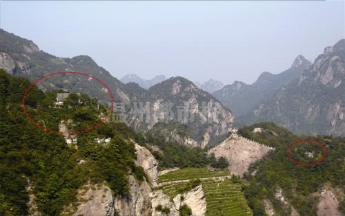 在雁荡山方洞景区入口处,可看见山上的两处违法建筑(红圈内)。