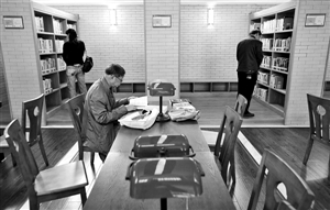 自助图书馆装修一新,偌大的阅览室里整齐地排列着四排桌椅,右边的开放式书架上,文学、历史、地理、医药等各类图书有序摆放,左边的陈列架上还有杂志、报纸、期刊供读者选择。