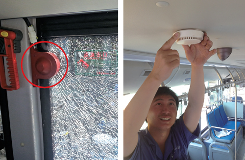 轻按驾驶室内的装置,车窗上的金属头(如左图红圈处),可将玻璃击破。这种装有“自动爆玻器”和“烟雾探测器”的公交车,月底将投入运营。