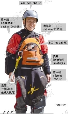 皮划艇运动装备分两种,静水划行:包括船、桨、救生衣,总价在4000元以内;激流漂流:包括激流艇、激流桨、激流救生衣、头盔、防水裙,总价在6000元以内。这些装备一般能使用很多年。