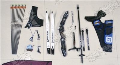 小跑的反曲弓装备,其中包括:弓片、弓把、护臂、护弓绳、护胸、护指、箭、箭袋、标准器、平衡杆。总价值八九千元。