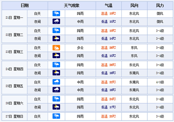 接下来的一周,温州以阴雨天气为主,太阳公公都不愿露脸。今天夜间至明天早上,雨水的势头会很足,将迎来一场中雨。由于接连的阴雨,我市这周的气温在15℃~20℃徘徊,大家要是外出,随身备雨伞和外套还是很有必要的。