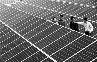 工作人员正在检查太阳能硅晶板。孙凛摄